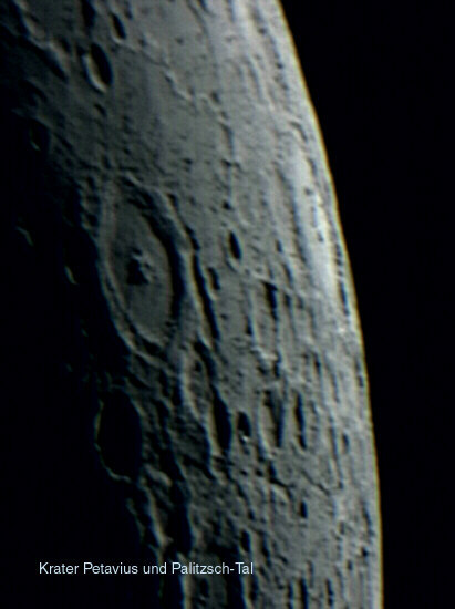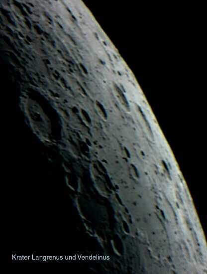 | Bericht: | Nachdem für das Wochenende Schlechtwetter angesagt war, nutzte ich den Abend noch aus, obwohl am nächsten Tag ein Arbeitstag war. Schon mit dem freien Auge war der Mond und die Venus oberhalb wunderschön anzusehen. Da es erst so spät Dunkel wird und die Zeit knapp war habe ich mich auf die Aufnahme der Planeten und ein paar Monddetails konzentriert. Die Aufnahmen wurden mit 2500 mm Brennweite gemacht. Nur bei Jupiter probierte ich 5 m Brennweite. Obwohl die Aufnahme nicht so schlecht war, gestaltete sich die Ausarbeitung des Bildes schwierig. Mit Registax wurde kein Bild brauchbar, ich griff wieder auf das Giottoprogramm zurück. Unten sieht man die Ergebnisse. Es zeigt sich immer wieder, dass man einen schönen Abend bei unseren Wetterverhältnissen zur Beobachtung nutzen sollte.