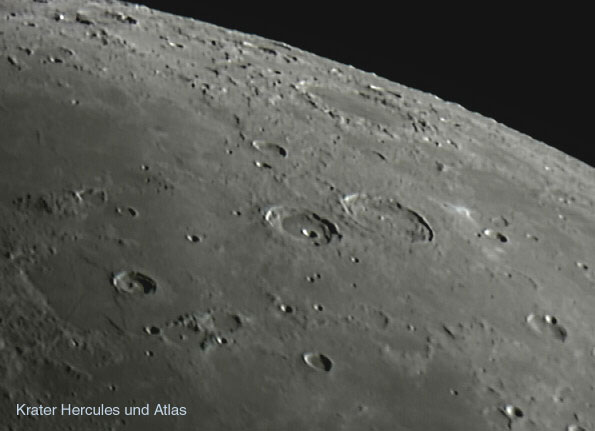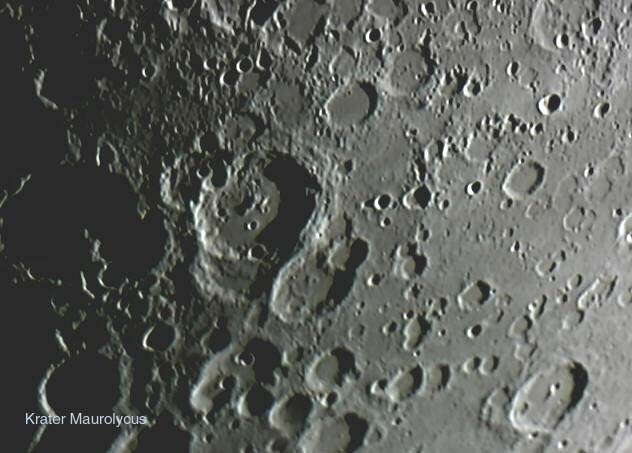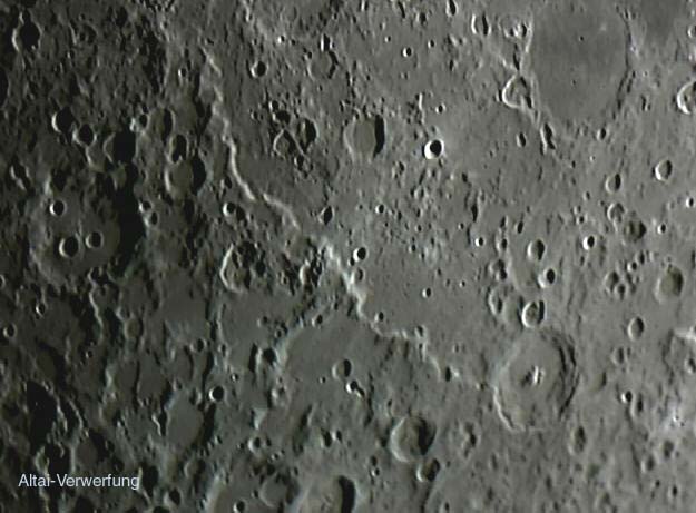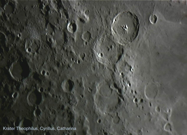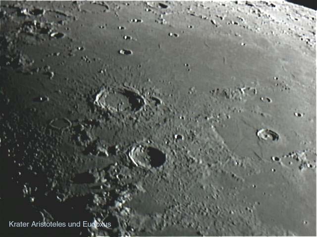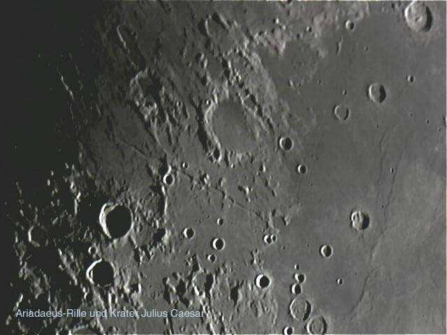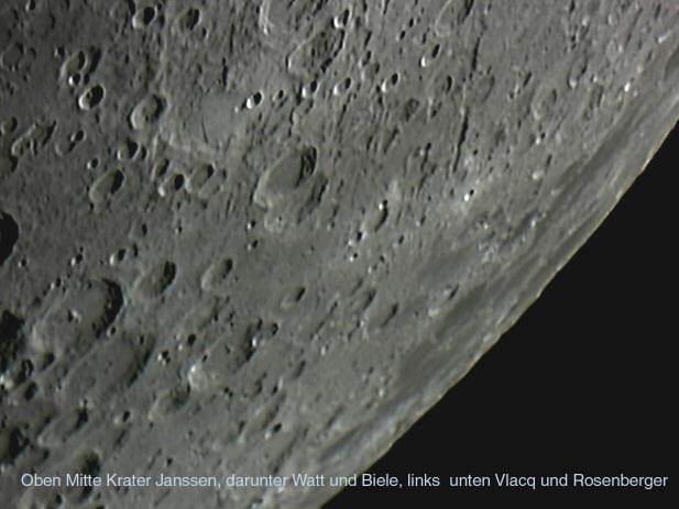 | Bericht: | Am Abend hatte ich die Wahl zwischen einem Fernsehabend, es spielte die Serie Star Trek Voyager 2. Teil oder dem Mond in einer interessanten Phase. Ich nehme an die Serie wird es noch öfter spielen daher gewann der Mond. Das Seeing erschien mir recht gut, die Ariadaeus-Rille war im 40 mm Okular in der Dämmerung sehr gut zu sehen. Ich muß gestehen ich bin ein Webcam-Fan und habe mich nur kurz mit visueller Beobachtung beschäftigt und mich gleich über die Aufnahmen gestürzt. Ich finde es faszinierend mit der Webcam über dem Mond zu spazieren und alle Krater oder besonderen Formation die mir gefallen aufzunehmen. Die Aufnahmen wurden alle mit 2500 mm Brennweite aufgenommen. Es sind jeweils etwa 300 Bilder, davon 20 - 15 Prozent mit Registax addiert und geschärft, Helligkeit und Kontrast angehoben. Nach der Ausarbeitung der Bilder sitze ich gerne mit dem Rükl Atlas und versuche alle erkennbaren Krater zu bestimmen, wer kennt schon alle auswendig!? Ich hoffe ich habe keinen Fehler bei der Bestimmung der Kater gemacht und bin offen für alle Verbesserungstips und Kommentare. Ich habe mir fest vorgenommen mehr visuell zu beobachten!!! carpe diem und clear skys Richter Gabriele