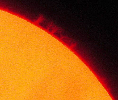 Es ist unser erster Kontakt mit dem Himmel im Rahmen der Namibia 2004 Tour der WAA. Nach dem Aufstellen der Instrumente machen Günther Eder und ich erste Schritte am Taghimmel. Mit dem C11 von Franz Kartusch und einen Lumicon H-Alpha Filter gelingt gleich eine spektakuläre Aufnahme von Sonnenprotuberanzen.