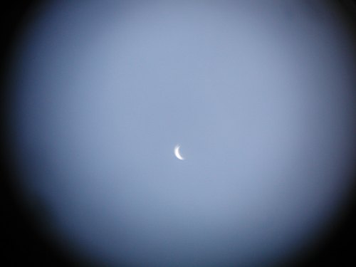 Im Celestron 8 der Hakos-Sternwarte stelle ich mit Hilfe von Markus Nagelholz die Venus ein - am Tag und ohne Goto! Trotz nicht optimalem Seeings ist die dünne Sichel beeindruckend. Venus ist übrigens ohne Probleme mit freiem Auge am Tag zu erkennen, wenn man weiss, wo.