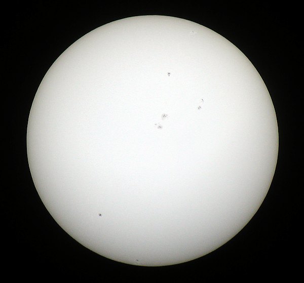 Michael Karrer hat seinen Refraktor mit Binokular aufgebaut und beobachtet die Sonne. Quasi im Vorbeigehen gelingt mir eine exzellente Aufnahme der Sonne. Michael verwendet die gleiche Olympus Digitalkamera wie ich und leiht mir dankenswerter Weise seinen Adapter.