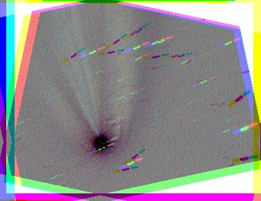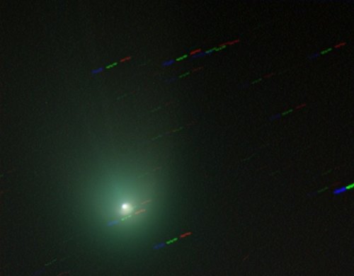 Das Ausarbeiten wird nicht ganz einfach, da die drei Farbauszüge zur Deckung gebracht werden müssen. AstroArt ist hier einsame Spitze: Stacken am Kometenkopf, Ausrichten der Bilder an den Anfängen der Strichspuren, etc. Man erkennt in dieser Farbaufnahme aus insgesamt 30 Aufnahmen zu je 20 Sekunden zwei schöne Jets im Schweif und eine deutliche Schale in der Coma. Die Sterne werden in Folge der Bewegung des Kometen zu Strichspuren, die je nach verwendetem Farbfilter entsprechend eingefärbt sind. Dieses Bild schreit förmlich nach einem Larson-Sekanina-Filter, der die Strukturen in Coma und Schweif verstärkt: