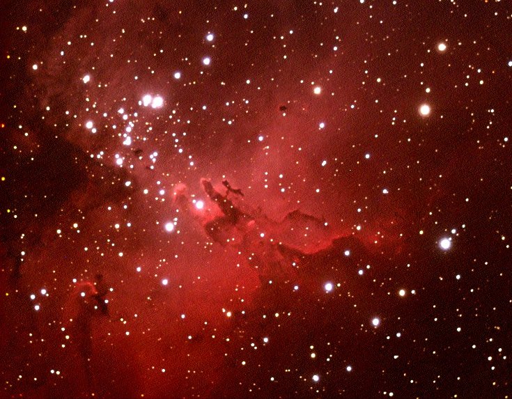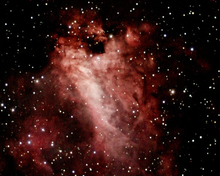 Gegen Mitternacht klart der Himmel auf. Es bleibt zwar eine Dunstschicht, die gut eine Größenklasse (bzw. die äußeren Filamente von Nebeln) kostet, aber immerhin kann ich mich zwei Klassikern widmen: M16 und M17.