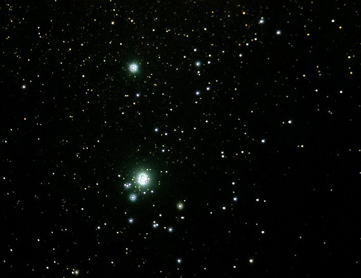 Der reiche Haufen ist fast schon zu groß für meinen Kamerachip. Die unterschiedlichen Farben der Sterne kommen sehr gut heraus. Auf der Suche nach anderen Objekten in dieser Region strapaziere ich TheSky und finde etwas, das mich interessiert: NGC 6193 im Altar, an der Grenze zum Lineal. Das Objekt wird als Sternhaufen mit Nebel beschrieben. Ich kann auf den Rohbildern zwar keinen Nebel erkennen, aber der Sternhaufen erweist sich als sehr interessant: Die lockere, grosse Sterngruppe zeigt eine markante Verdichtung nahe einem hellen Doppelstern, den ich in der Ausarbeitung nur durch einen schon fast unästhetisch starken DDP-Filter aus dem Seeingscheibchen herauslösen kann. Und in der Ausarbeitung finde ich dann auch den Nebel: Am obersten Bildrand der Rotauszüge erkenne ich feine Filamente (sie sind in der endgültigen Ausarbeitung des Sternhaufens nicht mehr zu sehen), das Objekt in Summe ist also zu gross für mein scheibares Feld.