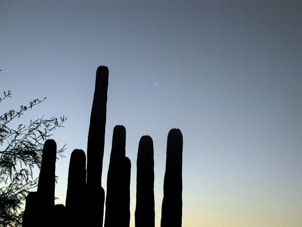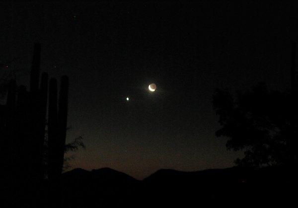 Die Bedeckung der Venus durch den Mond ist von Namibia aus nicht zu beobachten, denn der Mond zieht weit an der Venus vorbei. Parallaxen-Pech nennt man das, aber man kann im Leben eben nicht alles haben. Unter Tags beobachten wir, wie der Mond an der dünnen Sichel der Venus vorbeizieht. Auch sehr schön! Am Abend ergibt sich dann ein traumhaftes Bild.