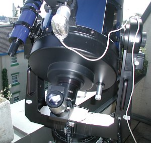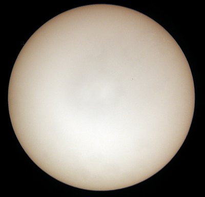An sich bin ich ein erfahrener Beobachter, aber ein paar Sachen gehören trotzdem ausprobiert vor so einem wichtigen Ereignis wie dem Venustransit. Insbesondere geht es darum, Ein- und Austritt mit der WebCam im Video festzuhalten. Am grossen Rohr mit 3m Brennweite ist mir das Feld zu klein, das Risiko, die Venus vor allem beim Eintritt nicht rechtzeitig zu finden, zu gross. Ausserdem wollen ja vielleicht Besucher durch das Rohr schauen. Also montiere ich einen Veteranen, einen kleinen Refraktor, der vor vielen Jahren eines meiner ersten Fernrohre war, huckepack. Das technische Setup braucht einige Zeit, bis die Sache mechanisch optimiert ist. Mit einer Brennweite von 600mm bekomme ich zwar auch nur einen Teil der Sonne ins Bild, ein gutes Drittel, aber dieser Maßstab sollte eigentlich optimal sein - Venus nicht zu klein, die Sonne nicht zu groß. Etwas Baader-Folie ist immer in Reserve, flugs war ein Sonnenfilter gebastelt, und es konnte los gehen. Mangels nennenswerter Sonnenflecken verzichte ich auf ein Bild, aber die Aufnahme mit 5 Bildern pro Sekunde sollte eine passable Wiedergabe in Echtzeit mit erträglich grossen AVI-Files gewährleisten. Dann teste ich auch noch mit der Digitalkamera, um spontane Schnappschüsse der ganzen Sonne durch das 50mm Plössl am Hauptrohr zu bekommen. Hier geht es einfach darum, den bestmöglichen Fokus zu finden und gleich fix einzustellen. Auch das funktioniert und es folgt ein Bild der so gut wie fleckenfreien Sonne. Leider verzeichnet das Okular doch; die Schärfe ist in der Scheibenmitte am besten, am Rand nicht so optimal. Aber immerhin. Dunkle Wolken ziehen von Westen auf. Es sind die letzten, die ich bis zum Transit sehen will - hoffen wir das beste! |