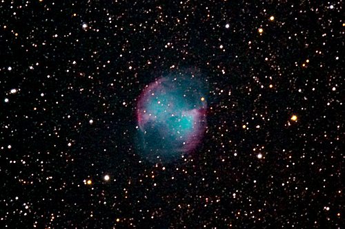 | Bericht: | Der Wetterbericht versprach eine zumindest teilweise klare Nacht, deshalb baute ich endlich wieder einmal meine Photoausruestung auf der Terrasse auf. Leider erforderten die durchziehenden Wolkenfelder eine sehr lange Geduld, aber als ich dann schon resignierend alles wegraeumen wollte zeigte ein pruefender Blick nach oben, dass es doch noch was werden koennte. Also beschloss ich doch noch einen Versuch mit M27 zu wagen, wenn auch die letzen Bilder der Serie schon in der rasch voranschreitenden Daemmerung gemacht wurden. Daten: 8x4min/ISO800, f=1512mm/F8.4