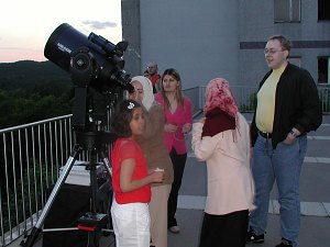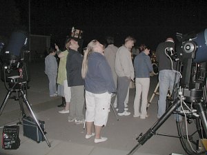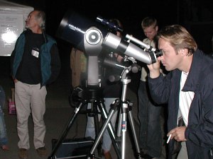 Spät aber doch wird es dann so dunkel, dass neben Mond und Jupiter auch noch andere Himmelsobjekte gezeigt werden können. Dank der sehr klaren Nacht - und der Leistungsfähigkeit unserer Teleskope - können wir auch einen Streifzug durch die Welt der Deep Sky Objekte anbieten. Zunächst begeistert der Kugelsternhaufen M13; er ist schon in den mittleren Spiegelteleskopen eine Wucht, doch in dem gewaltigen 18" Starsplitter ist sein Anblick unbeschreiblich, wert, die Leiter zum hoch gelegenen Einblick zu erklimmen. Die beiden planetarischen Nebel M57 und M27 begeistern ebenso, vor allem, da sie Zeugen vom Vergehen der Sterne sind. Der Wunsch wird laut, auch bei der Entstehung von Sternen "zuschauen" zu können; nun, leider geht das nicht so schnell, aber ein Blick zu M17 zeigt zumindest, wo dies gerade passiert. Albireo wiederum zeigt in beeindruckender Weise die Farben der Sterne. Noch ein Wunsch wird geäußert: Eine Spiralgalaxie! Rasch findet das computergesteuerte 12" Teleskop die Galaxie M51, und mit etwas Phantasie kann man die Spirale trotz der Stadtnähe gut sehen. Wirklich eine sehr gute Nacht. Jupiter verschwindet allmählich, doch ganz müssen wir nicht auf Objekte aus unserem Sonnensystem verzichten. Uranus steht zwar noch sehr tief, ist aber schon gut als weißlich-bläuliche Scheibe zu erkennen; Neptun steht zwar höher, ist aber kleiner. Und da sind ja auch noch zwei Kometen. C/2001 Q4 (NEAT) ist hell, rund, diffus und sehr deutlich, C/2003 K4 (LINEAR) ist auch sehr hell, aber konzentrierter und wirkt aufgefächerter. Nach Mitternacht ist sogar die Milchstraße im Schwan ansatzweise zu erkennen. Toll!