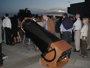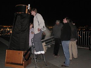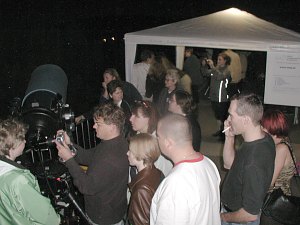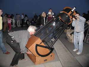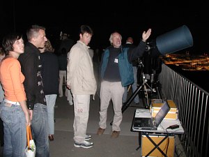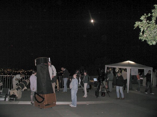 Ein 10" und ein 12" Dobson sind ja auch recht nett, doch der 18" (45cm-) Starsplitter stellt alle anderen Instrumente in den Schatten. Das ist ein Fernrohr! Durch so ein großes Fernrohr kann man nicht alle Tage durchschauen. Das Feuerwerk hat annähernd so viele Leute auf die Kahlenbergterrasse gelockt, wie letzten August die Marsopposition. Doch bald bemerken die meisten, dass man, ausser in der ersten Reihe, überhaupt nichts sehen kann. Kein Wunder, spielt sich das Feuerkwerk doch fast 400m tiefer ab. So ziehen einige enttäuscht ab, doch die meisten anderen Besucher finden bald bei einem Blick zum Mond oder zum Jupiter mehr als nur Ersatz. So entsteht ein Sternabend der Superlative, immerhin steht mehr als ein Dutzend, zum Teil sehr grosser Teleskope, zur Verfügung.
