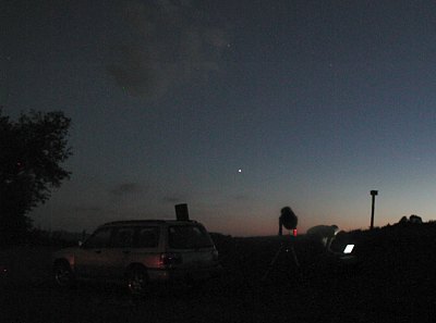 Offenbar ist die verzweifelte Gemeinschaft der Amateurastronomen so überrascht von dem unvermuteten Abend, dass nur wenige hierher kommen. Aber es lohnt sich. Auch wenn im Lauf der Nacht von Süden her immer wieder die Reste schwerer Gewitter über den Himmel ziehen, die Transparenz ist überwältigend.