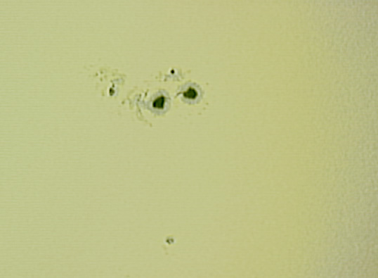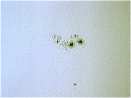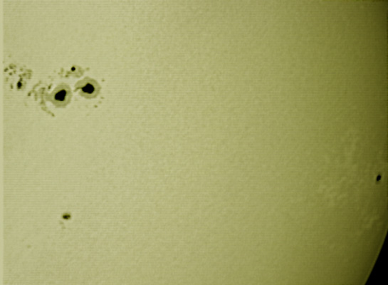| Bericht: | Nachdem bereits seit Tagen von einem großen Sonnenfleck berichtet wurde habe ich den Freitag Nachmittag genutzt um Web-Cam Aufnahmen zu machen. Eigentlich bin ich keine Sonnenbeobachterin, aber vom Venustransit hatte ich noch die Baader-Folie und daher den notwendigen Filter. Es sind meine ersten Aufnahmen von Sonnenflecken. Ich bin sehr beeindruckt von den Details die man auf den Aufnahmen sieht. Da meine Bilder eher blau wurden, konnte ich es nicht lassen sie mit Photoshop soweit möglich, gelber zu färben.