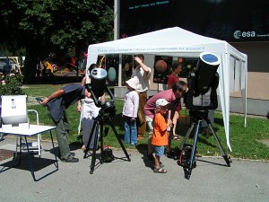 Wir wurden vom Österreichischen Weltraumformum, das die Wanderausstellung New Horizons in ganz Österreich organisiert, als lokal ansässiger astronomischer Verein zur Mitwirkung in Wien eingeladen, was wir auch gerne annahmen. Bedingt durch die Ferienzeit haben wir uns darauf geeinigt, jeweils Samstag und Sonntag Nachmittag mit unserer Mobilen Sternwarte die Sonne zu beobachten. Am diesem Samstag keine Kunst, es ist der erste richtig heisse Sommertag seit langem. Mit dem Begleiteffekt, dass die Besucher weitgehend ausbleiben - sie sind wahrscheinlich im Bad.