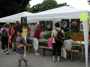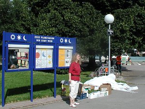 Der Aufbau einer mobilen Station ist ja schon fast Routine. Neu ist heuer bestenfalls der Umstand, dass gleich zwei mobile Stationen (Kuffner-Sternwarte und WAA) mit insgesamt vier Partyzelten aufgebaut werden. Auch gut. Durch eine kleine organisatorische Panne waren wir in dieser Phase zwar nur zu viert (Claudia und Doris von der Kuffi, eine Mitarbeiterin von WienXtra und meine Wenigkeit), doch das reicht ja zum Zeltaufbau, und von Mal zu Mal wurden wir schneller. Dann noch die Dekoration in Form unserer bewährten Astroposter und Ferienspielplakaten, drei Fernrohre für Sonne und Venus, die Mal- und Spielstation der Kuffner-Sternwarte - wir werden pünktlich fertig. Was sonst?