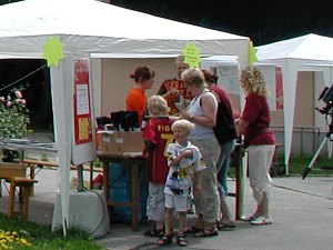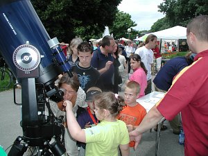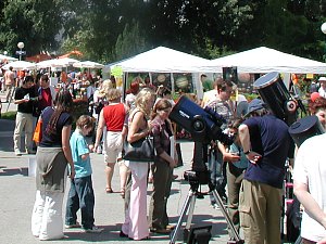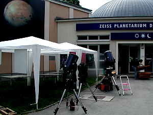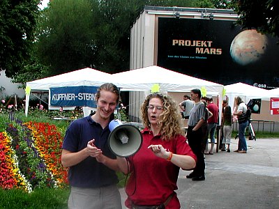 Am Vormittag und frühen Nachmittag ist es noch kein Thema; der Himmel gibt sich wolkenverhangen. Doch am Nachmittag bricht der Sommer mit unglaublicher Vehemenz durch, die Sonne brennt vom Himmel und das klimatisierte Planetarium wird mehr und mehr zum begehrten Zufluchtsort. Eifriges Verteilen von Zählkarten sorgt für so manche voll besetzte Show. Und das Marsrover-Modell ist ein Hit!