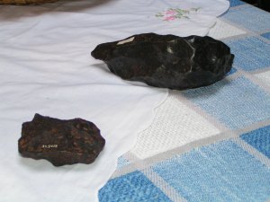 Als wir uns im Wohnzimmer des Hauses versammeln, dachten wir, alles gesehen zu haben. Doch die wahren Höhepunkte kommen erst: Exponate aus Prof. Wöss' Sammlung himmlischer Brocken. Den Anfang machen ein Eisen- (im Bild vorne) und ein Steinmeteorit (im Bild hinten). Den Anfang? |