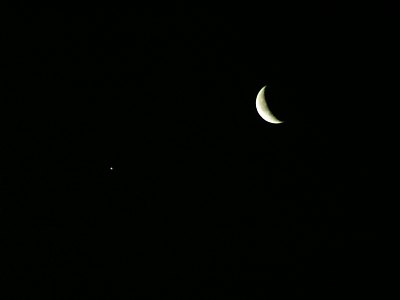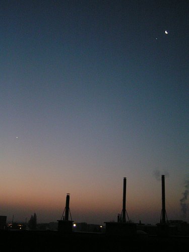 Was für ein Morgen! Die abnehmende Mondsichel steht knapp bei Jupiter und Venus steht tief im Südosten. Schnell ein paar Fotos ... Und jetzt ab ins Büro. Fortsetzung hoffentlich am Abend! |