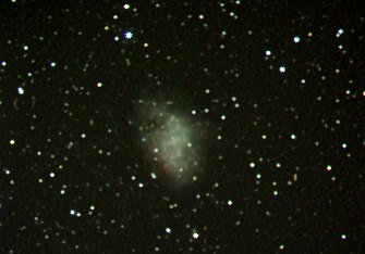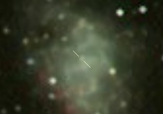 Die kurze Belichtungszeit bei M1 macht sogar den Crab-Pulsar sichtbar. Leider war das Seeing nicht gut, weshalb die Sterne doch nicht so ideal punktförmig werden. Doch die Strukturen im Nebel kommen schön heraus.