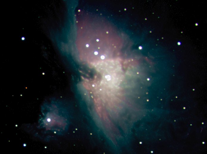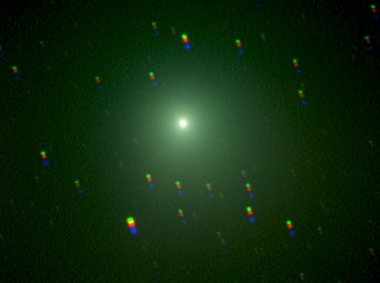 Mit der CCD-Kamera (StarlightXpress MX916) geht doch viel, viel mehr weiter als mit einer Digitalkamera, sie ist viel empfindlicher. Aus den insgesamt 600 Sekunden = 10 Minuten Belichtungszeit erhalte ich so viele Photonen, dass alle Tricks der digitalen Bildverarbeitung inklusive sinnvoller Bildvergrößerung möglich werden. Toll, was da so alles herauskommt. Jetzt zum Kometen Machholz. Ich nehme ihn mit der gleichen Konfiguration und Belichtungszeit auf, wie den Orionnebel. Nur sind alle nachfolgenden Bilder jetzt nicht vergrößert, sondern 100%, der Rand weggeschnitten (RGB-Versatz).