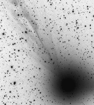 | Bericht: | die bewegung des plasmaschweifs war schon bei den aufnahmen bemerkbar. nun habe ich davon 5 stück (je 2 minuten) zusammengefügt. der zeitraum beträgt 1 stunde. wegen der lichtschwäche des schweifs kann man die bewegung in der negativdarstellung wesentlich deutlicher darstellen. (um die datei klein zu halten ist nur ein verkleinerter ausschnitt des originals wiedergegeben.) erholsame feiertage und ein gutes (astro)jahr 2005 wünscht euch michael karrer