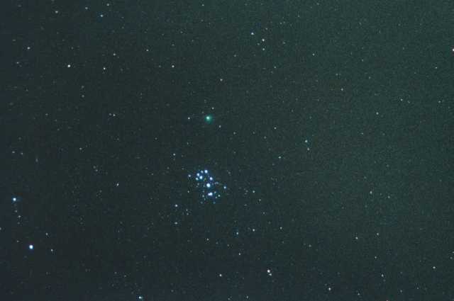 | Bericht: | Nachdem der Abend nicht sehr erfolgversprechend aussah, klarte es doch gegen 22h auf, sodass ich nach langer Zeit (und wahrscheinlich auch das erste mal im Jänner) das C-8 mit der SuperPolaris Montierung auf der Dachterrasse aufstellte. Grandios waren Saturn, M41/42 zeigte wunderschöne Strukturen, aber auch die offenen Sternhaufen M36,37,38,41 bieten auch am Stadtrand einen sehr schönen Anblick. Grund für die Beobachtung war natürlich die Annäherung von C/2004 Q2 zu den Plejaden. Visuell kein Schweif erkennbar, fast kreisrunde Koma. Ich fotografierte mit einer Kleinbildkamera (400ASA Negativfilm) "piggyback" auf dem C-8 mit einer Brennweite von 70mm, Belichtungszeit ca. 2 Minuten