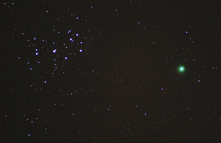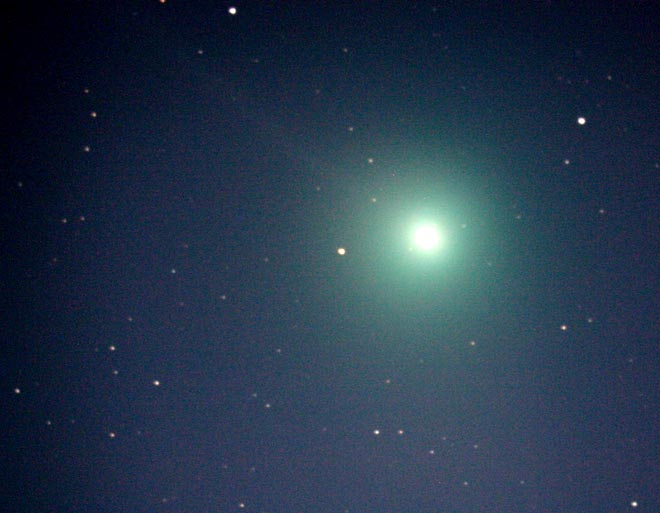 | Bericht: | Komet Machholz erscheint im 20 cm SC-Spiegel strukturlos, bester Anblick im Feldstecher als interessanter Kontrast zu M45. Den schönen Farbunterschied zwischen den bläulichen Plejaden und dem grünen Kometenkopf (Koma) brachten allerdings nur die Fotos heraus. Details zu dem Foto: Canon EOS300D, 200 mm Tele f/5.6; 2 Bilder je 30 Sekunden mit Setting ISO 1600 kombiniert. In der Nachbearbeitung Kontrast verstärkt, darüberhinaus keine digitale Nachbearbeitung. Kamera auf Meade-Telekop montiert.