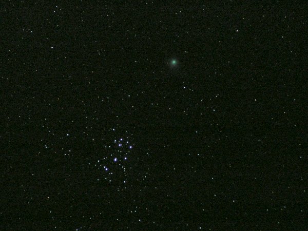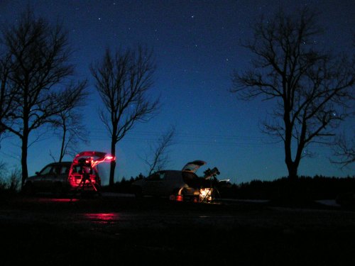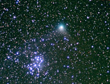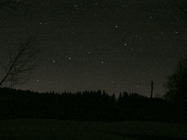 Dritter Tag der Passage des Kometen C/2004 Q2 (Machholz) bei den Pleiaden und heute ist das Wetter zunächst eindeutig traumhaft. BOLAM kündigt gegen Mitternacht eine deutliche Wolkenfront aus NW an, aber bis dahin sollte einer tollen Beobachtung nichts im Wege stehen. Da Samstag ist, wird die Ebenwaldhöhe als Ziel gewählt. Ich komme schon früh hinauf, einige Beobachter sind schon da und bauen ihre Instrumente auf. Die Temperatur war während der Fahrt auf den Berg von +4°C im Tal auf unglaubliche +10°C hier in 1000m Höhe geklettert. Die einzige böse Überraschung hier: Sturm! Ich wähle daher, wie die meisten anderen auch, einen windgeschützeren Platz und opfere damit den halben Himmel (Westen), aber dort habe ich ohnedies nicht vor, zu beobachten. Ausserdem konzentrieren sich alle auf einen einigermassen trockenen Fleck am Rande des Parkplatzes, der ansonsten doch eher eine Schlammwüste ist. Reste von Schnee schmelzen friedlich vor sich hin ... Bald ist es so dunkel, dass der Herbst- und Winterhimmel in ihrer ganzen Pracht über uns erstrahlen (Anmerkung für alle, die sich jetzt wundern: Nachdem die Sternbilder "einer Jahreszeit" ein Viertel des Himmels einnehmen, aber der halbe Himmel zu sehen ist, sind an einem Winterabend zunächst die Herbst- und die Wintersternbilder zu sehen; die Herbststernbilder gehen im Lauf der Nacht unter, dafür kommen im Osten schon die Frühlingssternbilder herauf). Auch der Komet C/2004 Q2 (Machholz) ist deutlich; ich vergleiche ihn mit dem Stern ο Persei (3,8 mag) und der Komet erscheint mir etwas schwächer, also rund 4mag. An Fotos ist kaum zu denken, aber mit der huckepack montierten MX916 mit 50mm Objektiv geht es. Doch zunächst ist die Minolta Dimage Z1 dran. Mit äquivalent 380mm Brennweite fotografiere ich den Kometen und die Pleiaden 30 Sekunden lang mit 400 ISO. Dann ist die CCD-Kamera dran. Mit dem 50mm Objektiv, aber viel kleinerem Kamerachip, ergibt sich ein Feld, das in etwa dem der Minolta entspricht. Mit der schwarzweiss aufnehmenden MX916 mache ich mit RGB-Filtern ein Farbbild aus drei Aufnahmen zu je 60 Sekunden. Die CCD-Kamera ist schon viel empfindlicher. Heute kommt der blaue Gasschweif wirklich gut heraus, es ist hier schon wesentlich dunkler als auf der Sofienalpe. Ich versuche mich noch mit der MX916 und einem 135mm Tele, doch da macht der Sturm schon einen Strich durch die Rechnung. Nach dem Motto "besser ein schlechtes Bild als gar kein Bild" zeige ich hier trotzdem das Resultat von 10 x 60 Sekunden Schwarzweissaufnahme. An weitere Fotos, etwa von Deep Sky Objekten, ist nicht zu denken. Wir machen uns einen schönen visuellen Beobachtungsabend. Das freut besonders unsere Gäste, die - und das muss man sich einmal auf der Zunge zergehen lassen! - angeregt durch unsere Veranstaltung beim Ramba Zamba Riesenspielefest im Rathaus das erste Mal am Rathausplatz durch unsere Fernrohre geguckt haben und heute schon hierher gekommen sind, um einen wirklich guten Himmel zu sehen. Roland, Hut ab, das ist perfektes Astro-Marketing! Alle schönen und auch viele kleinere Objekte des Winterhimmels werden beobachtet. Über M42, M1, M35 bis M38, h+χ Persei, die Pleiaden, aber auch über M31 und M33, M81 und M82 oder auch den Eskimo-Nebel oder den Eulen-Nebel möchte ich gar nichts schreiben, sie begeistern uns genauso wie unsere Gäste, die, wie gesagt, teilweise heute den ersten Kontakt mit einem wirklich guten Himmel haben. Bemerkenswert sind einige kleinere Objekte, wie der kleine Sternhaufen NGC 2158 nahe bei M35, der heute wirklich extrem deutlich ist. Oder die kleinen offenen Sternhaufen NGC 2126 und 2281 im Furhmann. Oder die Kugelsternhaufen M79 (leider sehr tief) und NGC 2419, der "intergalaktische Wanderer" im Luchs. Auch die planetarischen Nebel NGC 2371 in den Zwillingen und M76 sind interessant, beide sind korkenförmig. Nach 22 Uhr MEZ wird die Bewölkung von Nordwesten her stärker, zunächst tief, aber gegen 23 Uhr nimmt sie schon den halben Himmel ein. Abbau. Es war ein schöner, wenngleich nicht perfekter Beobachtungsabend hier auf der Ebenwaldhöhe, aber wir konnten die Passage des Kometen Machholz bei den Pleiaden drei Abende lang verfolgen, und das ist wirklich toll für unsere Breiten zu dieser Jahreszeit. |