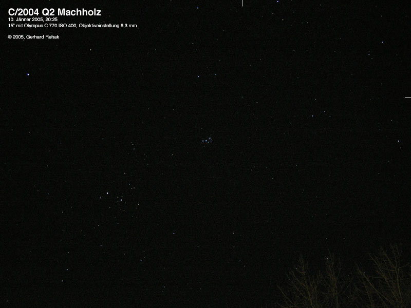 | Bericht: | Man nehme die nigelnaglneue Olympus C770, sucher verbissen irgendwelche Einstellungen. Ach ja, hier - im Modus "M". Man kann also tatsächlich die Belichtungszeit auf 15 Sekunden ausdehnen. Und die Empfindlichkeit wird schnell auf 400 ASA gedreht und schon packt mich der Experimentierwahn. Auf einem winzigen Tischstativ montiert stelle ich den Auslöser auf Fernbedienung, damit die Kamera nicht wackelt, es wird ca auf die Plejaden gezielt - im Sucher sieht man ja nix und schon saugt die Kamera 15 Sekunden Licht auf den CCD Sensor. Schon am Display der Kamera leuchten tatsächlich ganz wunderbar die Plejaden. Und gleich rechts drüber ein Nebelpunkt - Sensation! Es klappt tatsächlich! Das allererste reine Digitalfoto - einfach so aus der Hüfte, komplett mit Komet. Endlich also ein Erfolgserlebnis im neuen Jahr - mal sehen was es sonst noch bringt.