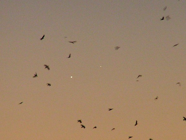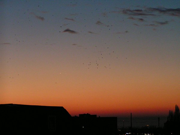 Wieder tolle Morgendämmerung. Rasch vor der Arbeit ein Blick zum Himmel, da ist es ja, das Planetenpaar Merkur - Venus. Gestern Flugzeugm heute kleine Wolken und viele Vögel, ein netter Vordergrund. Also ehrlich, wenn das so weitergeht - am Abend superklar und am Morgen interessante Objekte ... |