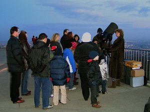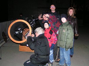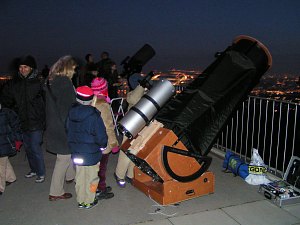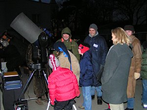 Endlich steigt auch Saturn über die Bäume im Nordwesten. Wir stehen noch tief unter dem Eindruck der gestrigen Huygens-Landung auf Titan, die wir am IWF in Graz live miterleben durften. Auch diese Stimmung überträgt sich auf unsere Gäste, nur ganz wenige sind enttäuscht, dass Titan nur ein kleiner Punkt im Fernrohr ist. Die meisten sind verwundert, dass man ihn überhaupt sehen kann - und schwer beeindruckt von dem wunderschönen Anblick des Saturn.
