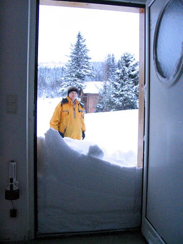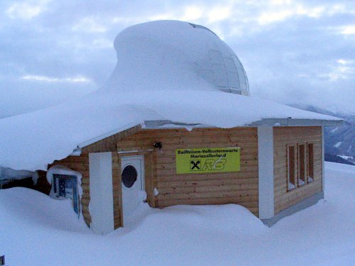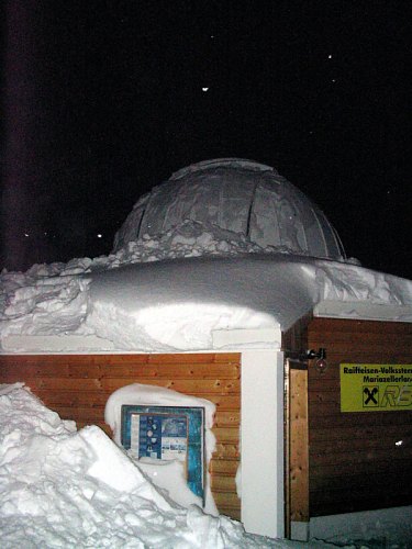 An der Sternwarte. Anbei ein paar Impressionen. Schneehöhe teilweise bis an die 2m - bei der großen Schneewächte vor dem Zugang sogar noch höher. Die Gartenhütte hinter dem Haus ist nicht mehr zu sehen. Zugang zur Sternwarte war etwas beschwerlich: Teilweise sank man bis zur Hüfte ein; jetzt, nachdem man eine Spur hat geht’s ein wenig besser. Habe dann die Kuppel abgeschaufelt, dreht sich jetzt wieder. Inwieweit der Spalt auch schon wieder zu öffnen ist, habe ich nicht versucht, hoffe auf ein wenig Sonne morgen, die das Abschmelzen des Kuppelschnee erledigt. Okay, das wars fürs Erste – bis bald wieder mal.