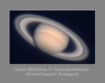 | Bericht: | zu feucht und zu diesig, alles von einer frostschicht überzogen, und minus 10 grad, freuten mich nicht, deep sky zu versuchen. aber die luftruhe war sehr gut und ich wollte meinen takahashi an saturn an sein limit bringen: zumindest konnte meinen besten 4 zoll saturn einsammeln. projektion mit 5x televue powermate auf ca. f 45, aufnahme mit webcam bei 5 bilder pro sekunde (bei dieser kälte eine geduldsprobe). neun serien a 1200 bilder. die verwendungsrate von 90 prozent ergab die erfreulich hohe anzahl von 10.160 bilder zum schärfen!