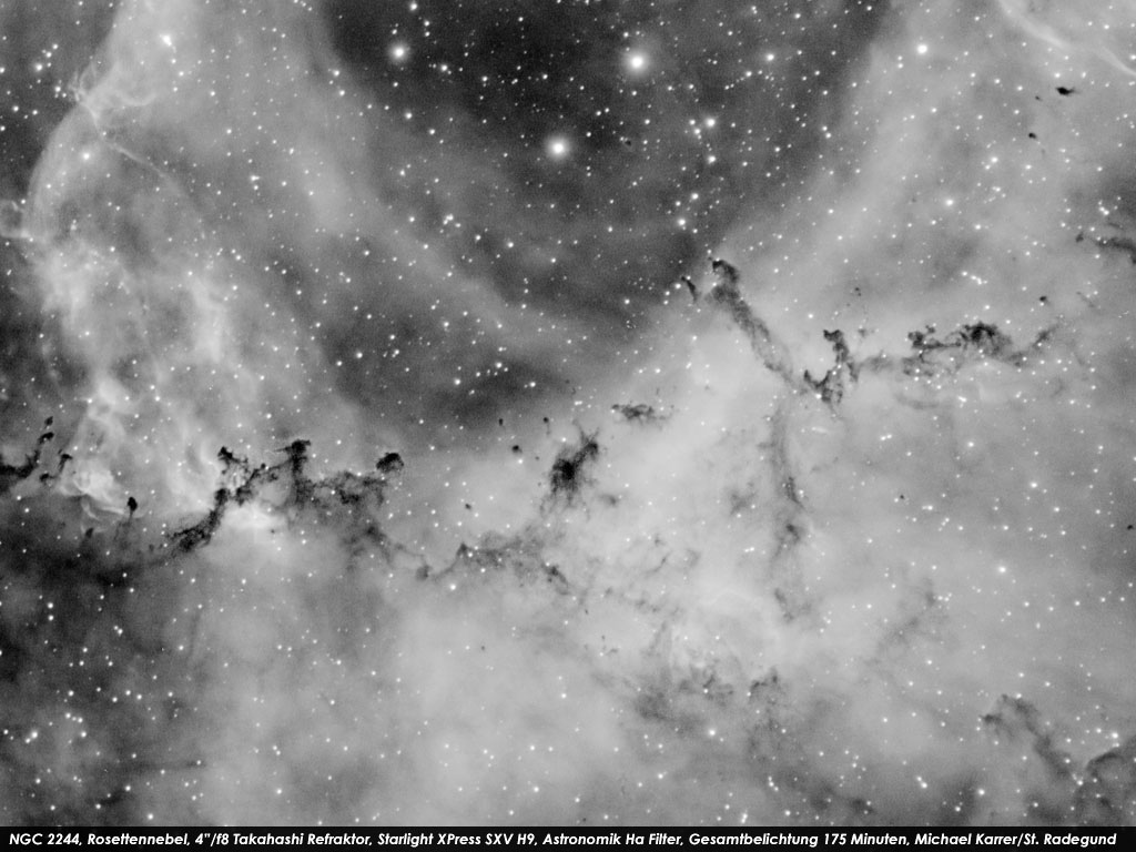 | Bericht: | ein versuch einer detailaufnahme des rosettenenbels. bei einem öffnungsverhältnis von f8 kommt man bei deepsky nicht unbedingt ins schwärmen. die knapp 3 stunden belichtungszeit zeigen aber doch etwas. allerdings hätten weitere 2-3 stunden die tiefe und möglichkeit des schärfens deutlich verbessern können.
