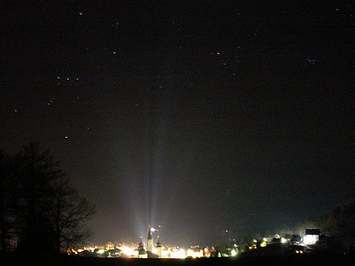 Doch bald weicht die Idylle einer recht unangenehmen Realität, nämlich der der Lichtverschmutzung. Die neu renovierte Basilika wird - natürlich die ganze Nacht - extrem hell angestrahlt und so ist die Westhälfte des Himmels, zumindest heute, bei leichtem Dunst, zu vergessen. Zum Glück gibt es noch eine Osthälfte. Der Scheinwerferkegel reicht wirklich bis in den Zenit!