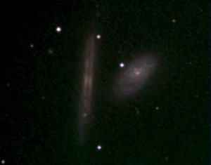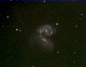 Auch sehr schön, nur leider wird das Seeing schlechter. Und bei M100, sie steht jetzt im Südsüdwesten, kommt der Himmelshintergrund schon durch. Noch etwas macht die Sache spannend: Der "Todesstreifen" - die Umlegezone der parallaktischen Paramount-Montierung im Meridian. Bei der Aufnahme von M100 war es ein Zittern, ein feilschen um Sekunden. Es ging sich aus ... Ich gehe zu schwierigeren Objekten über und wähle zwei Galaxienpaare. Zum einen die "Antennnengalaxien" NGC 4039/39. Sie stehen sehr tief und sind daher weniger eindrucksvoll; OK, so etwas fotografiert man in Namibia. Dann das originelle Paar NGC 4298 und NGC 4302. Eine Kantengalaxie mit deutlicher Staubbahn und eine kleine, kompakte Spiralgalaxie. Leider wird das Seeing immer schlechter und auch die Durchsicht nicht besser.
