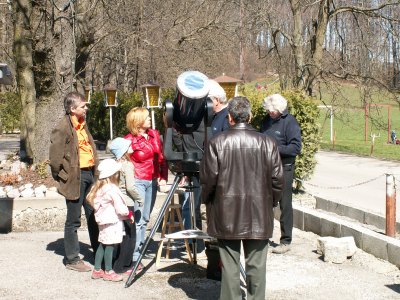 Außer einer kleinen Fleckengruppe nahe der Scheibenmitte hat die Sonne aber nichts zu bieten, auch die Protuberanzen sind heute eher mickrig. Nach der Sonnenbeobachtung begeben wir uns ins Seminar "Besser beobachten - Jupiter und Saturn", in dem vor allem das Kapitel über Jupitermonderscheinungen für Furore sorgt - schön, dass heute Nacht welche zu beobachten sind. Nach dem Seminar erwartet uns ein wunderschöner Abend ...