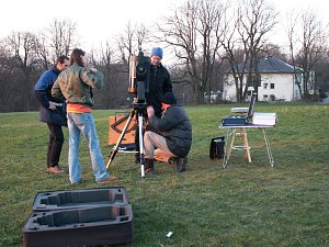 Während die Sonne langsam versinkt, bauen wir unsere Instrumente - insgesamt 10 - auf; das lockt viele Spaziergänger an, denen wir bereitwillig erklären, was wir da machen. Einige versprechen, wiederzukommen, wenn es dunkel geworden ist. Und halten ihr Versprechen auch!
