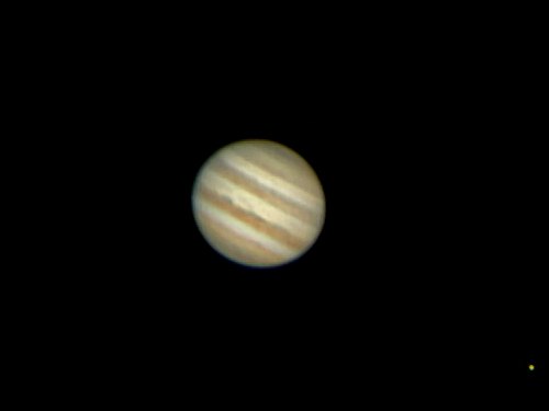 Noch ein Blick zu Jupiter. Die Monde alle ziemlich in Elongation, also keine besondere Erscheinung. Und der Planet auch vom Seeing sehr gezeichnet. Umso bemerkenswerter, dass sich dann in einer Webcam- Aufnahme (300 von ca. 820 Frames verwertet) der GRF am Rand zeigt. Interessant!