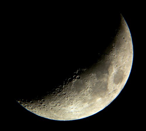 Wie heisst es so schön? Any observing is better than no observing. Zugegeben, ich habe schon lange durch kein Fernrohr mehr geschaut und so stören mich das Funkeln der Sterne und der aufgehellte Himmel heute nicht. Schon der erste Blick zum Mond zeigt, dass es sich gelohnt hat, denn der Erdtrabant zeigt heute eine besonders schöne Phase: Das Kratertrio Theophilus - Cyrillus - Katharina sowie der Altai-Abhang stehen nahe am Terminator.