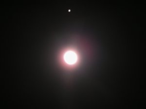Obwohl ich den ganzen Tag auf der Terrasse alte Blümchen ausgebuddelt und neue eingepflanzt hatte und ziemlich abgekämpft war, konnte ich nicht widerstehen, das Rendezvous zwischen Mond und Jupiter zu beobachten. Es war bitterkalt, und der Mond hatte auch noch einen recht bunten Hof, aber es war trotzdem ein bezaubernder Anblick, Jupiter über dem Haupt des Mondes thronen zu sehen.