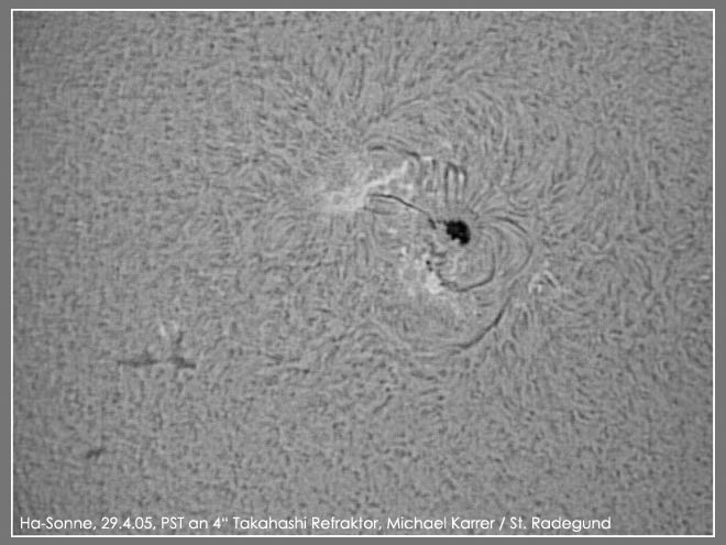 | Bericht: | nach längerer zeit ein großer fleck mit attraktiven strukturen im h-alpha-licht. visuell sehr schön, besonders mit binokular. die ernüchterung kommt, wenn man die webcam benutzt. das mäßige seeing zaubert die besten verzerrungen. dennoch: ein versuch war's wert.