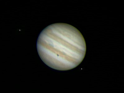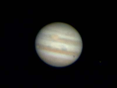 Etwas später, um 22.06 Uhr MESZ, steht Europa schon seitlich von Jupiter. Io rückt dem Planeten näher, das wird ein Durchgang mit späterem Schattenvorübergang (doch daraus wird nichts werden). Der Schatten von Io befindet sich jetzt im Zentralmeridian, der GRF ist auch schon da. Fast so schön, wie am Dienstag auf der Uni-Sternwarte. Aber eben nur fast. Bemerkenswert ist auch eine mächtige Störung in der EZ, die vom NEB (unten) in einer sehr blauen Wolke ausgeht. Interessant auch die zahlreichen Turbulenzen in der NPR.