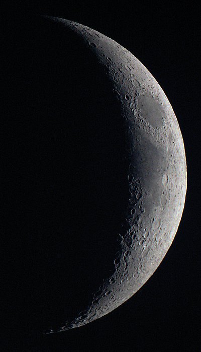 | Bericht: | Ein sehr klarer Abend und die Erwartung interessanter Jupitermonderscheinungen lassen mich bald das Fernrohr aufbauen, damit es in der Dämmerung gut abkühlen kann. Dabei ergibt sich die Gelegenheit, bei zunächst gutem Seeing der dünnen Sichel des zunehmenden Mondes einen Besuch abzustattetn. Mit dem 75mm Projektionsokular mache ich eine recht gute Aufnahme und versuche in Folge, die gestrigen Digicamtests am Mond zu wiederholen - mit dem überraschenden Ergebnis, dass das Stacken von Digicamfotos vom Mond überhaupt keinen Qualitätsgewinn bringt, im Gegenteil! So bleibt es bei einem Schnappschuß.