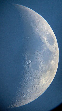 Schon bald sehen wir den Mond am blauen Himmel stehen; anfangs noch etwas kontrastarm, doch bald ist er im Fernrohr ein schöner Anblick.