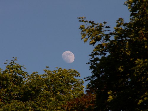 Noch eine kleine Änderung gegenüber dem Programm der letzten Führung: Heute ist auch der Mond zu sehen, und schon am hellen Tag steht er, nicht zu übersehen, am klaren Himmel über den Bäumen des Sternwartegeländes.
