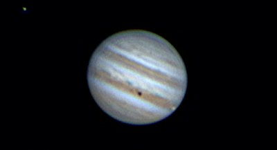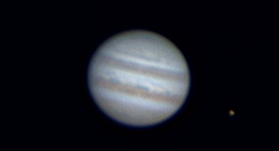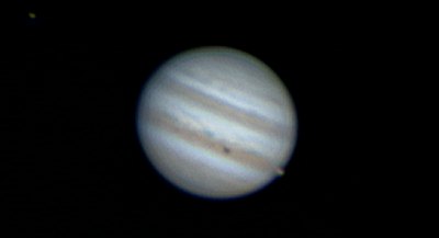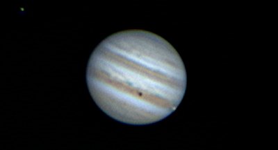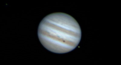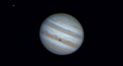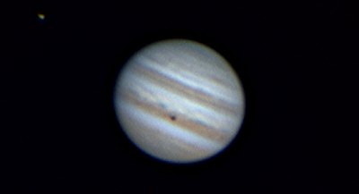 Eigentlich wollten wir Jupiter erst später und den Mond noch länger beobachten, doch eine schöne Jupitermonderscheinung sollten wir nicht versäumen: Io und ihr Schatten wandern gerade über den Planeten, bald wird der Mond auftauchen. Das verlangt nach einer sehr langen Webcamserie. Anfangs ist das Seeing noch recht schlecht, doch zum Gl&auuml;ck wird es besser, so dass Aufnahmen mit 4,5m Brennweite möglich werden. Alle nachstehenden Aufnahmen werden so gewonnen, verwertbar sind dann jeweils rund 400 Frames à 1/25s und recht wenig Nachverstärkung. Alle Bilder sind verkleinert wiedergegeben. Norden ist unten, Osten links. Was passiert: Io wandert (in der Serie von links nach rechts) mit ihrem Schatten über den Planeten, Europa entfernt sich, nach einer Bedeckung, von Jupiter. Es wird vor allem interessant sein, ob bzw. ab wann Io zu sehen sein wird.