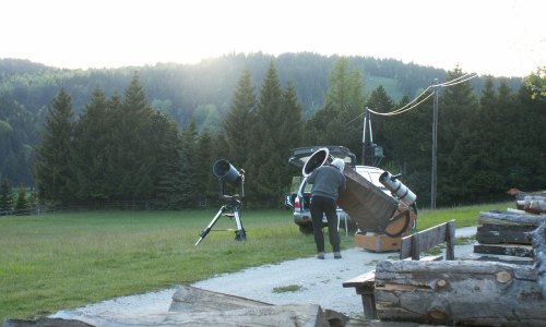 An sich kein Abend für eine Ausfahrt: Helles Mondlicht und ziemlich durchzogen mit Cirren. Aber Beobachten ist heute auch nicht unbedingt das Ziel des Abends, sondern eher eine Erkundungsmission der Hohen Wand. Dieses weitläufige Areal wird schon von vielen WAA-Mitgliedern bevorzugt besucht, und eigentlich sollten wir es auf unserer Homepage ordentlich dokumentieren. Das ist das eigentliche Ziel dieses Abends, und es gelingt auch, siehe hier. Doch Mond und Jupiter sind lohnende Ziele, und so schlagen Roland und ich hier auf einer Wiese beim Gasthof Postl - einem der vier interessanten Plätze - unser Lager auf; das Gelände ist übrigens so weitläufig und der Gasthof so gross, dass sich hier leicht ein Teleskoptreffen veranstalten liesse.