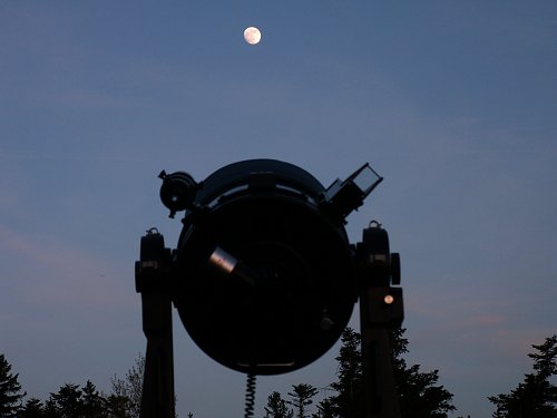 Sogar bei Tageslicht ist der Mond recht interessant, und erst recht in der Dämmerung. Schön ist hier auch, dass - ähnlich wie auf der Sofienalpe - viele Neugierige auf einen Blick vorbei schauen, solange es noch hell ist. Kein Wunder, ist der Gasthof Postl wie die anderen Gasthöfe und Hütten auf der Hohen Wand ein beliebtes Ausflugsziel und vor allem ein Zentrum der Paragleiter.