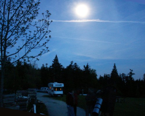 Das helle Mondlicht ist natürlich nicht geeignet, die Dunkelheit des Platzes zu beurteilen, aber viel küstliches Licht sieht man nicht. Die einzige größere Stadt, Neunkirchen, ist vom Wald weitgehend abgeschirmt. Zu später Stunde besuchen uns noch ein paar Camper. Und nach ein paar kosmolgischen Diskussionen stellt eine Camperin die Frage in den Raum, wie man das alles freiwillig lernen kann. Aber ja, kein Problem! Die Fact Finding Mission auf der Hohen Wand ist erfolgreich und wir werden diesen Platz sicher öfter besuchen, zumal die Fahrzeit von meinem Wohnort im Süden Wiens gerade einmal 40 Minuten beträgt. |