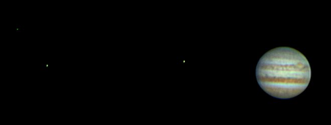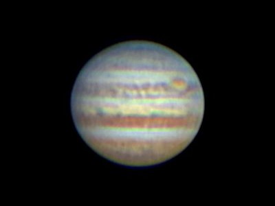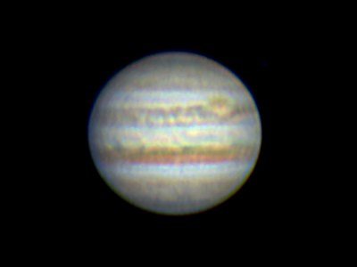 Es gibt im Leben nur einen Fehler, nämlich eine Chance auszulassen. Zum Glück begehe ich diesen heute nicht. Nach dem gestrigen schönen Beobachtungsabend auf der Hohen Wand und dem heute viel dunstigeren Wetter denke ich erstens nicht daran, hinauszufahren, und zweitens gar nicht ans Beobachten. Doch dann betrachte ich die wenigen hellen Sterne, die von diesem dunstigen Dämmerungshimmel leuchten, und mir fällt auf, sie flimmern nicht. Also doch aufbauen. Tubus Temperieren ist heute kein Thema; es ist so warm, dass mein Instrument eher zu kühl als zu warm ist. Ein erster Blick zu Jupiter: Spitze! Wir hatten ja schon einige Abende mit gutem Seeing, aber heute rührt sich gar nichts. Ich mache ein paar Aufnahmeserien von Jupiter mit Brennweiten von 4,5m, 6m und 9m (1,5x, 2x und 3x Barlowlinse bei F=3m); einmal mehr stellt sich heraus, dass die 4,5m die optimale Brennweite für die ToUCam sind; die Blende entspricht f/15 und bei 12" kommt noch genug Licht durch. Zu dunkel dar's nicht werden - so entstehen nämlich diese grauslichen Gradientenartefakte wie gestern. Serien von ca. 1000 Aufnahmen (1/25s) gehen sich gerade noch aus, sonst schlägt schon die Planetenrotation zu. Und - fast alle sind bei 90 Prozent Qualitätsschranke verwertbar. Soviel zum Seeing, und jetzt lassen wir die Bilder sprechen. Norden ist unten, Osten links. Wunderschön sieht man, wie der GRF - in dem sogar Details zu erkennen sind! - rasch zum Planetenrand wandert und eine wilde Störung im SEB erzeugt. Das NEB ist auffällig dunkel und auffällig rot - auch visuell - während das SEB durch die Störung sehr hell ist. Bemerkenswert auch die türkisblauen Wolken am S-Rand des NEB. Die Polarregionen sind sehr ruhig heute, keine Spur mehr von den vielen Bändern. Zwischendurch noch ein Bild mit 3m Brennweite, es zeigt auch drei der vier hellen Monde, nur Ganymed ist sich nicht mehr ausgegangen. Wie gesagt. Hätte ich mich von den nicht so optimalen Bedingungen beeinflussen lassen, hätte ich einen der besten Jupiter-Abende heuer versäumt. |