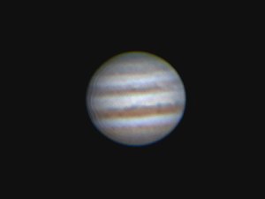 Eine sehr seltsame Struktur im SEB des Jupiter (im Bild das obere Band, da Osten links, Norden unten) halten wir zunächst für den GRF, doch er ist es nicht. Ein schönes Bild, dabei ist auch die Jupitersaison bald vorbei. Doch das dominierende Gestirn des Abends ist natürlich der Mond. Mit seiner schon sehr weit fortgeschrittenen Phase erhellt er die lange Dämmerung, dunkel wird es in dieser Nacht sicher nicht. Macht aber auch nichts.